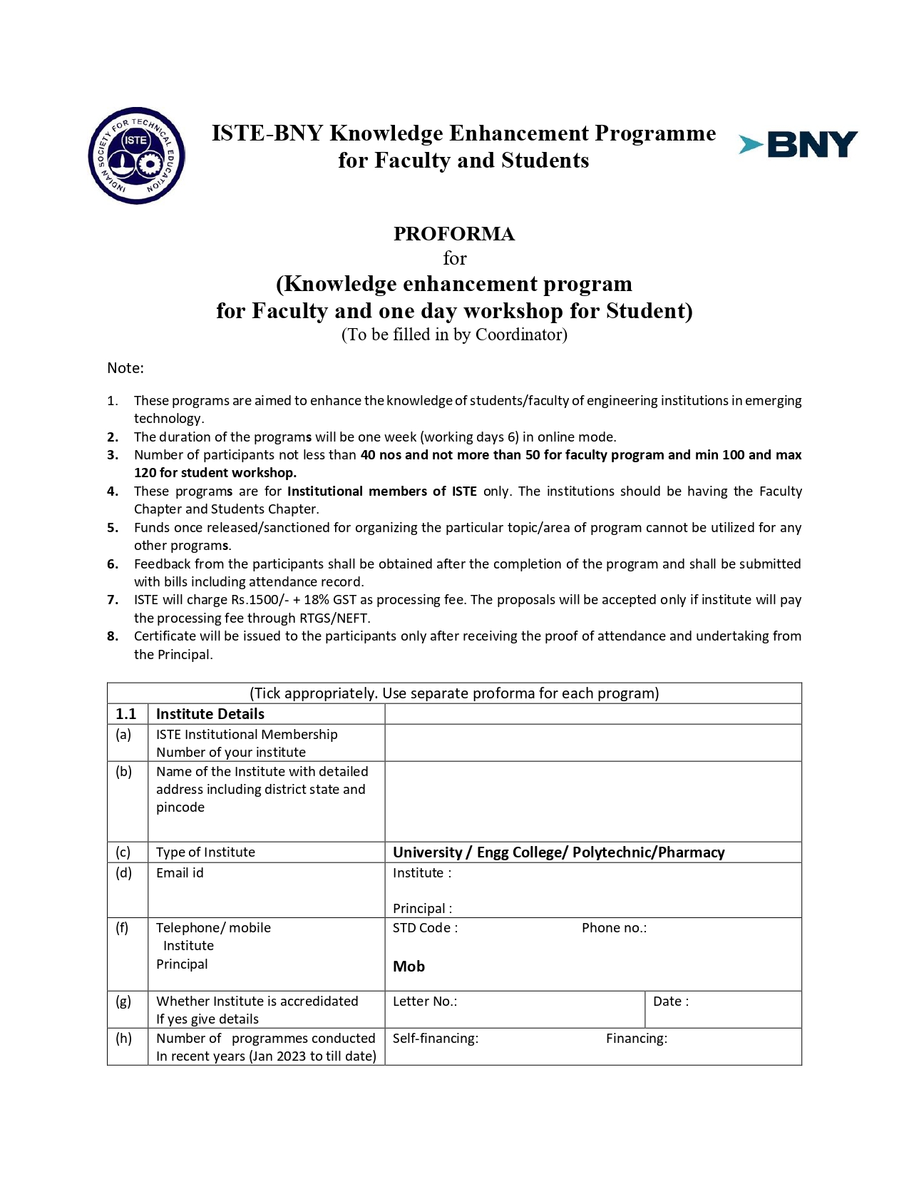 An institute may submit a maximum of two proposals in each category, and the selection will be done jointly by ISTE and BNY.